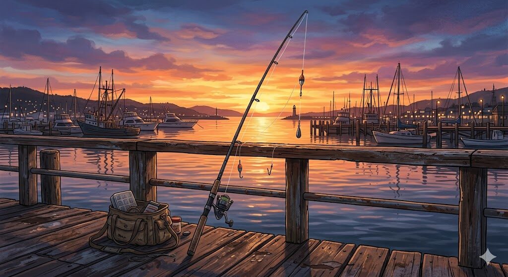 春の瀬戸内漁港でメバリングをする釣り人のイラスト